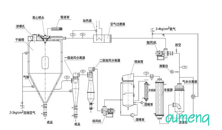 裝置**針對于有機溶劑,以使用循環氮氣而形成的惰性氣體介質取代通常的空氣介質,來進行噴霧干燥。除了能回收產品之外,尚可回收有機溶劑。針對有機溶劑低閃點或者微毒的特點,易燃易爆的特點**設計該套閉式循環噴霧系統。